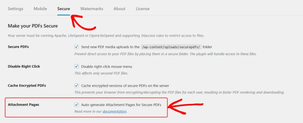 By default, attachment pages are not generated for PDFs stored in secure mode. To enable them, go to Settings > PDF Embedder > Secure and check the Auto-generate Attachment Pages for Secure PDFs option.