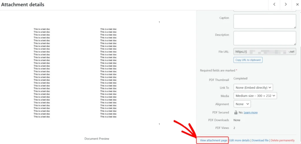 From there, click on your PDF to open the attachment details panel. In the right column, click the View attachment page link to open the standalone page where your PDF will be displayed in the embedded viewer.